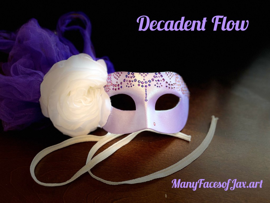 A masquerade half mask in a pearl finish. She is adorned with an oversized flower, tulle, and rhinestone accents including her nose stud.