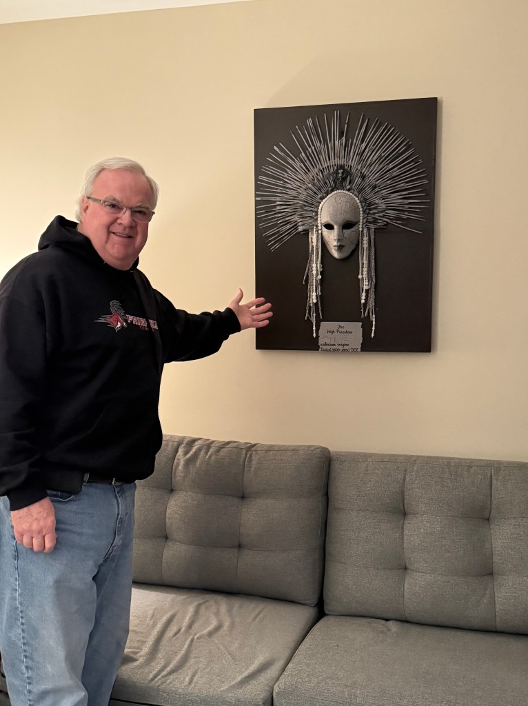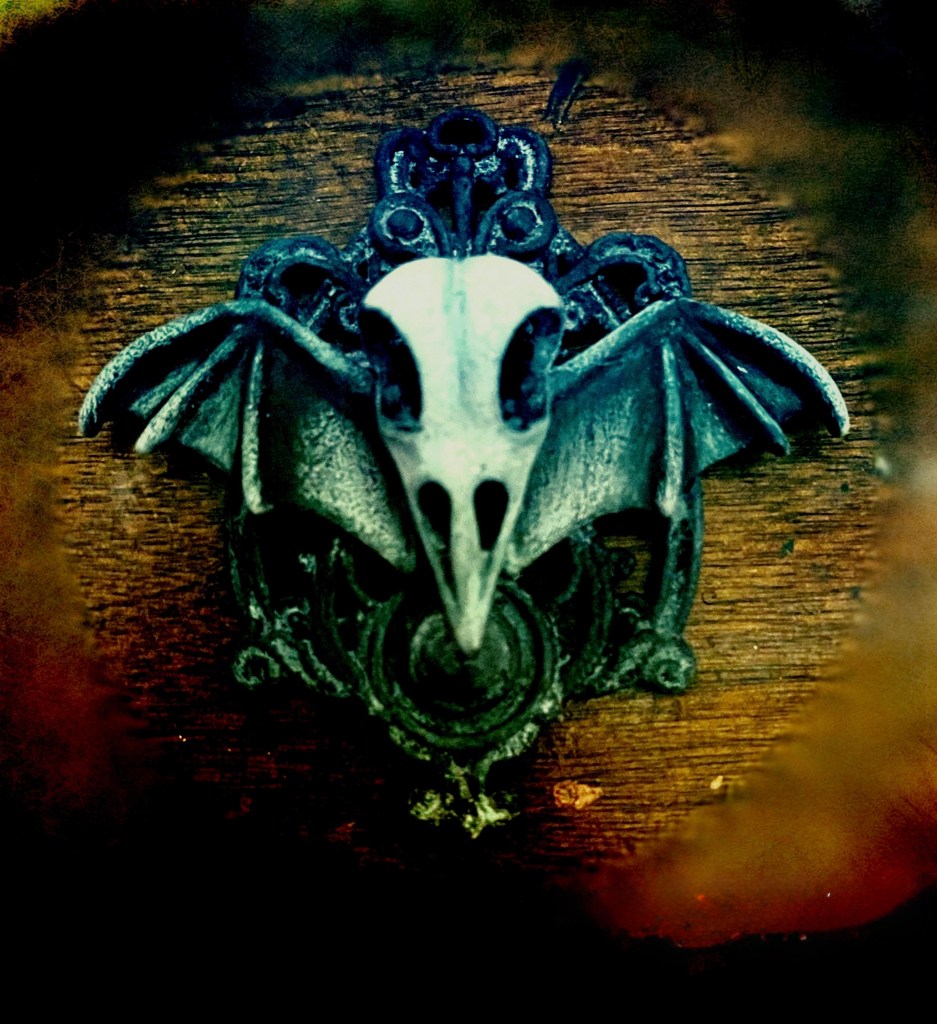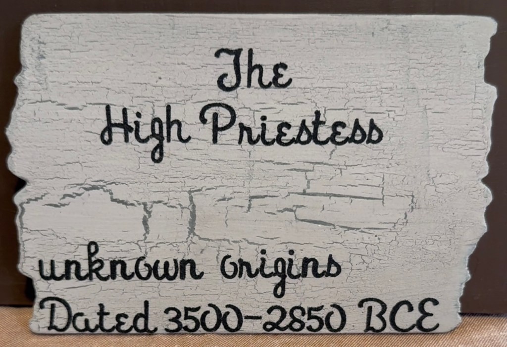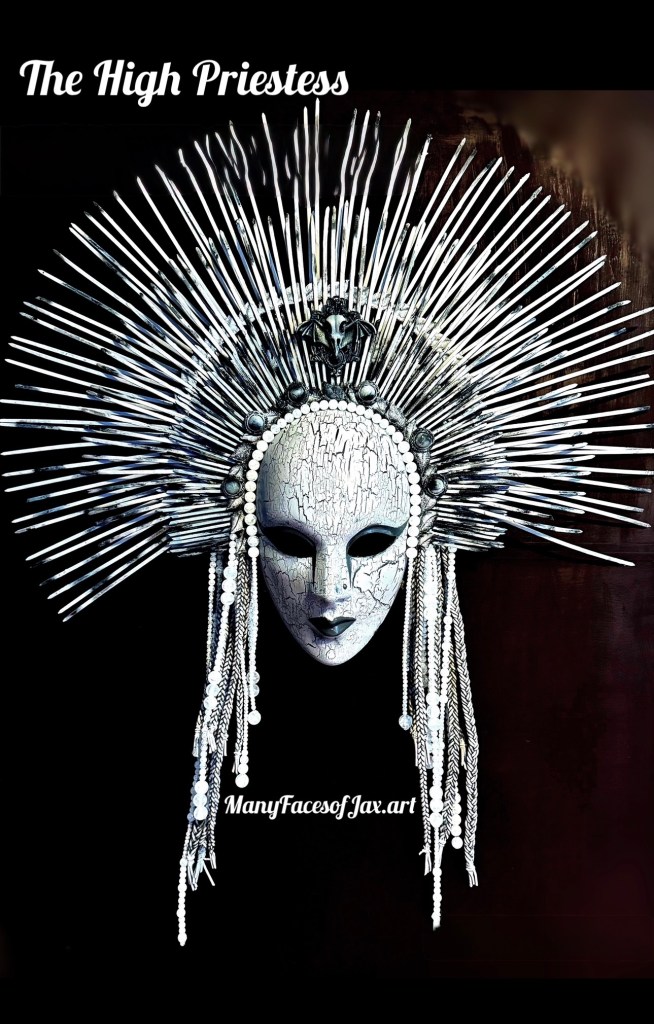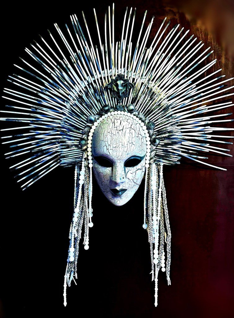 A full face masquerade mask. She was commissioned to be made based off of the appearance of “The Stone Goddess”. She is painted using a crackling method and wears a nose stud. Her crown is adorned with leather braids and hanging glass accents. She has dark lipstick and heavy winged eyeliner and over exaggerated fox eye. The man who bought this could not be happier with her. Limited edition, only one has ever been made.