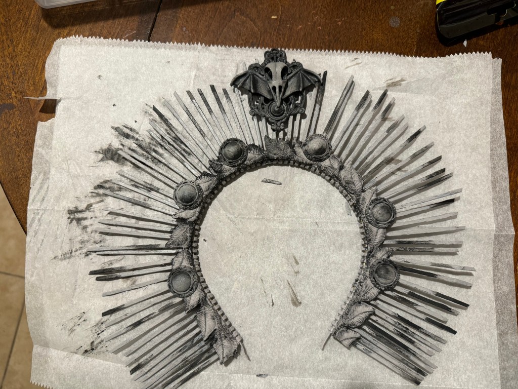 Materials used: PVC plastic, leather cord, glass beads, metal halo headband, zip ties, metal pendant, metal and plastic buttons, fabric trim, acrylic paint and sealer, rhinestone, and ribbon.