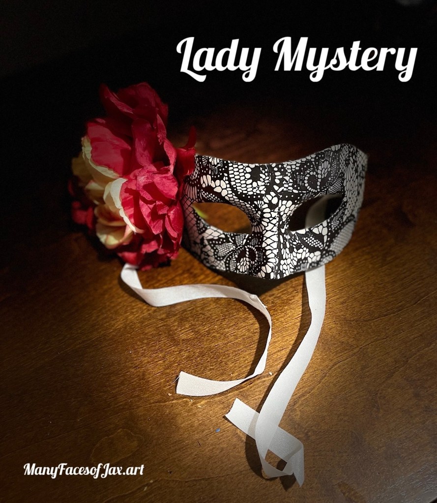 A masquerade half mask designed to look like lace with an oversized flower on her right side.