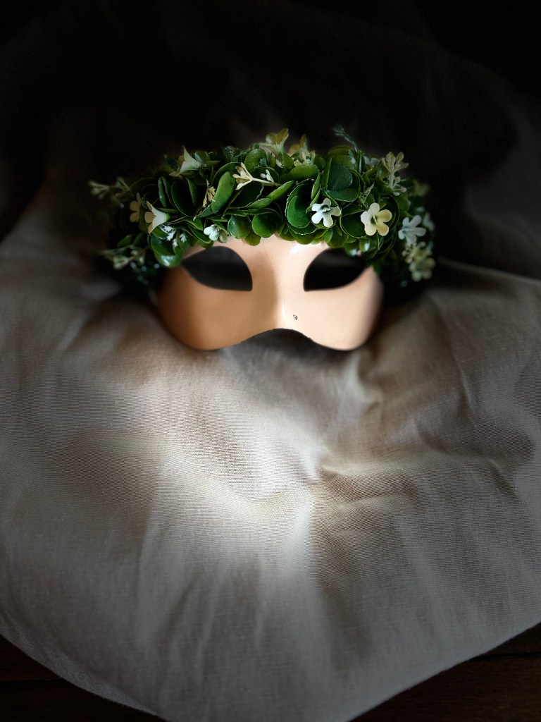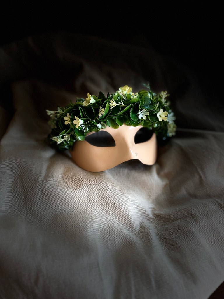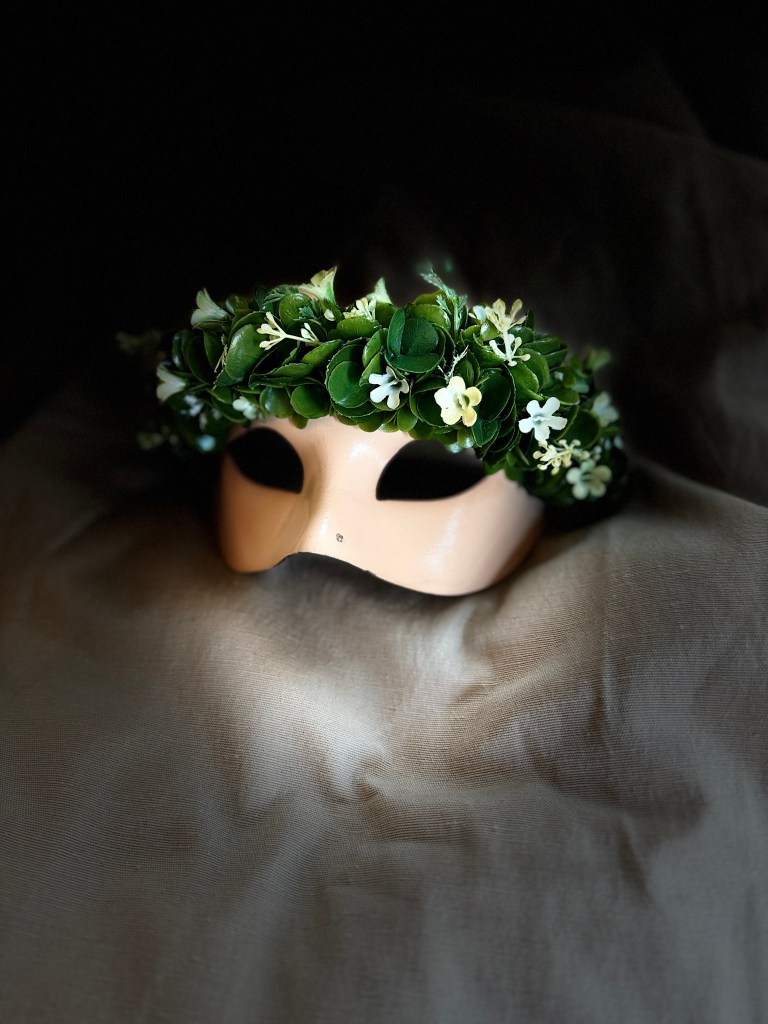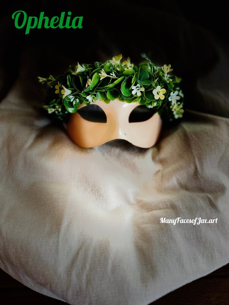 A masquerade half mask adorned with a crown of foliage and small flowers. The name Ophelia is of Greek origin meaning “help” or “aid”. The name is commonly associated with William Shakespeare’s “Hamlet”.