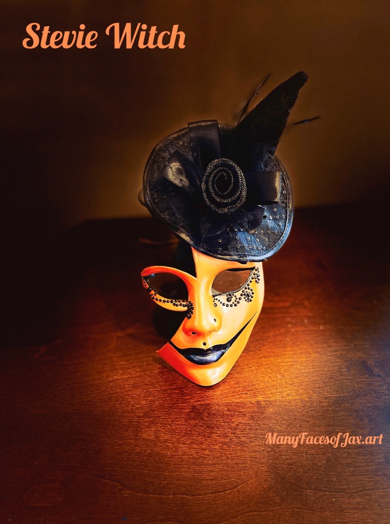 A masquerade mask adorned with a witch’s fascinator. Her makeup is a perfect winged eyeliner and her lipstick has exaggerated smile lines. Her eyes are decorated with rhinestones, and she is wearing nose and lip studs.