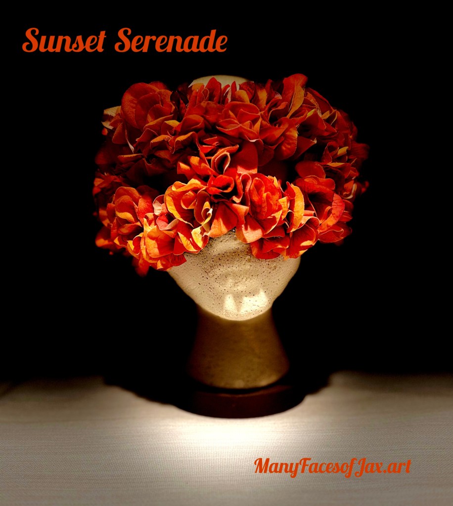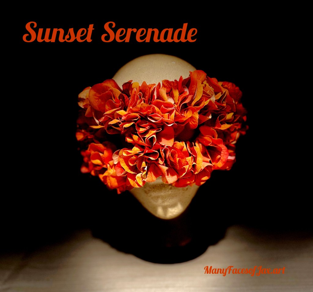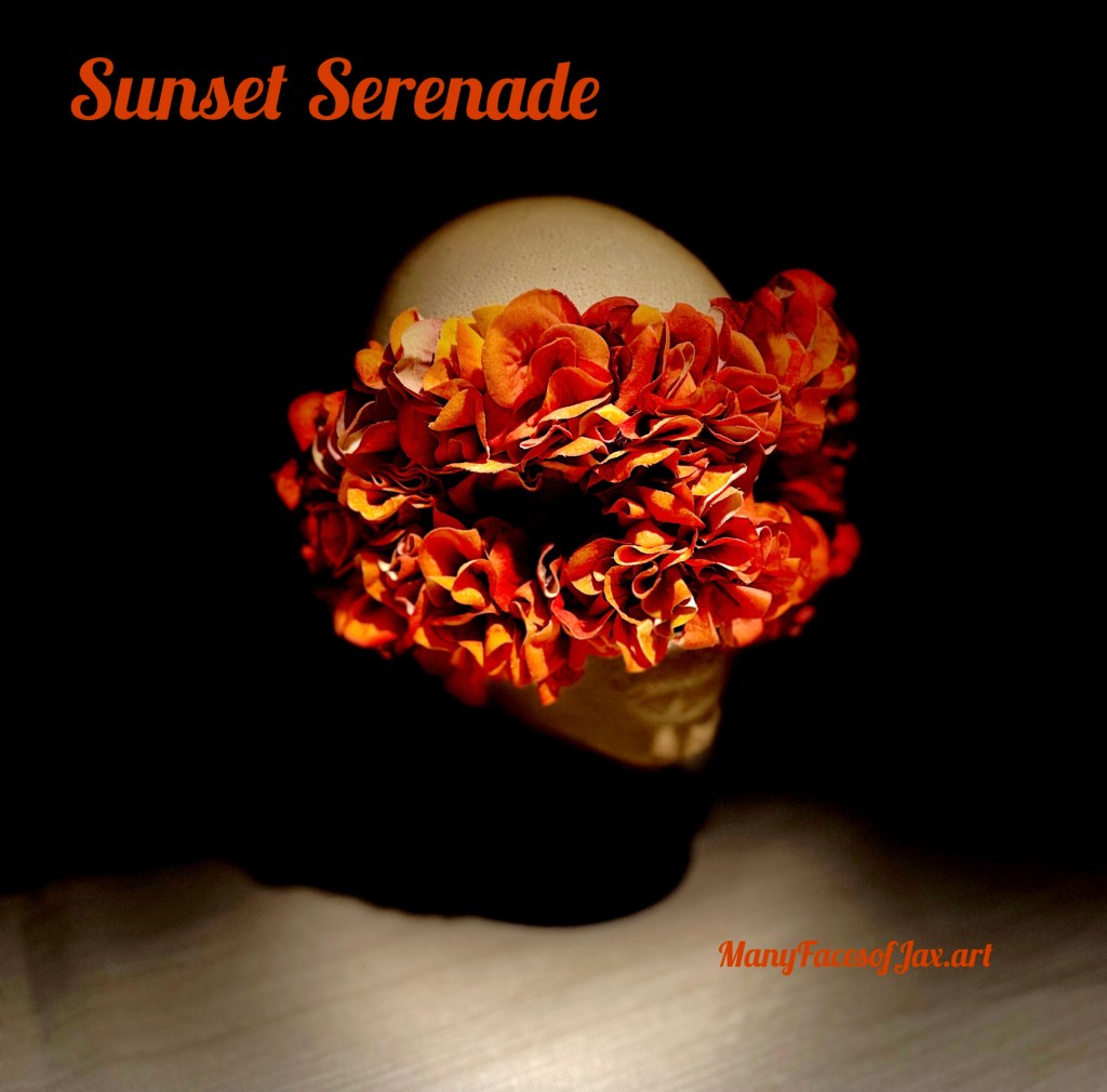A follow up to 2023’s “Floral Disguise”, Sunset Serenade is a masquerade half mask covered in hundreds of multi-toned orange faux hydrangea petals.