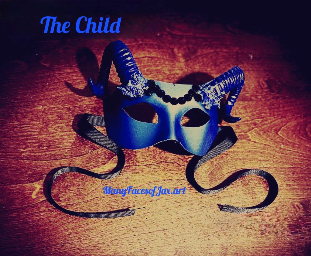 A masquerade half mask adorned with dark blue horns and black spikes. I wanted to make a mask for my son to have and he chose all of the elements including his favorite color. (This is an accurate representation of when he was a toddler, lol. He is now 18.)