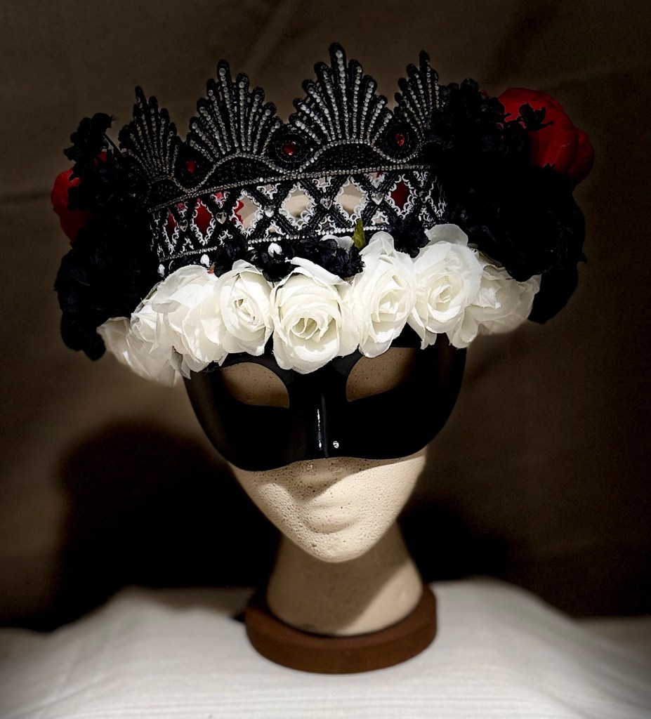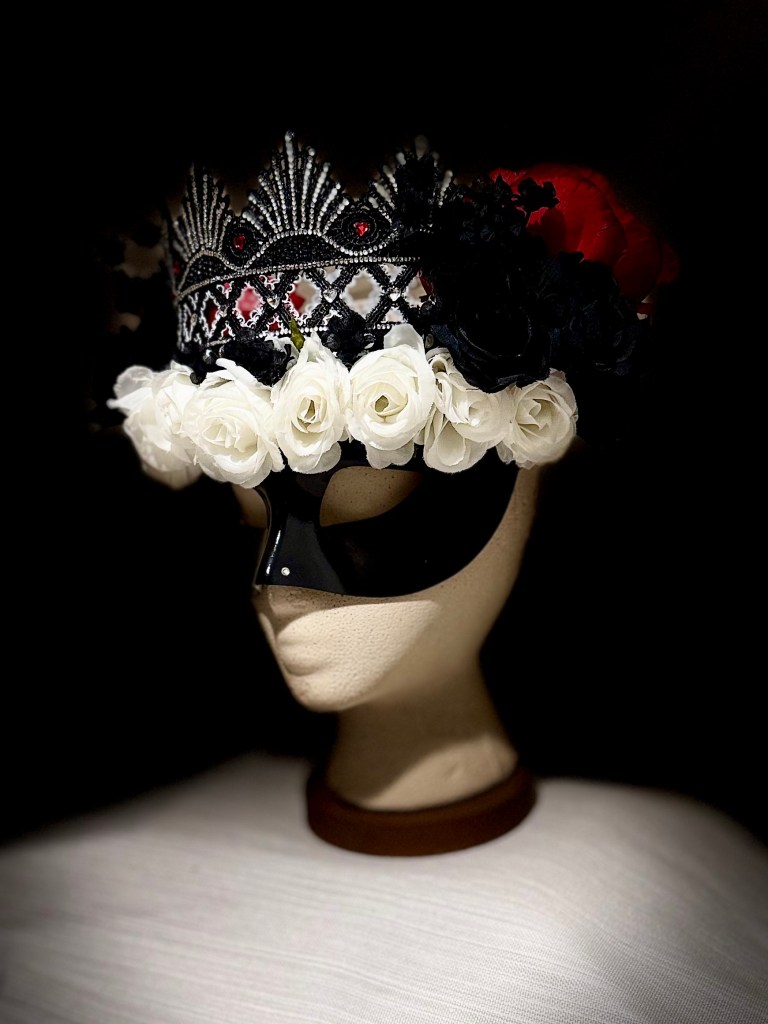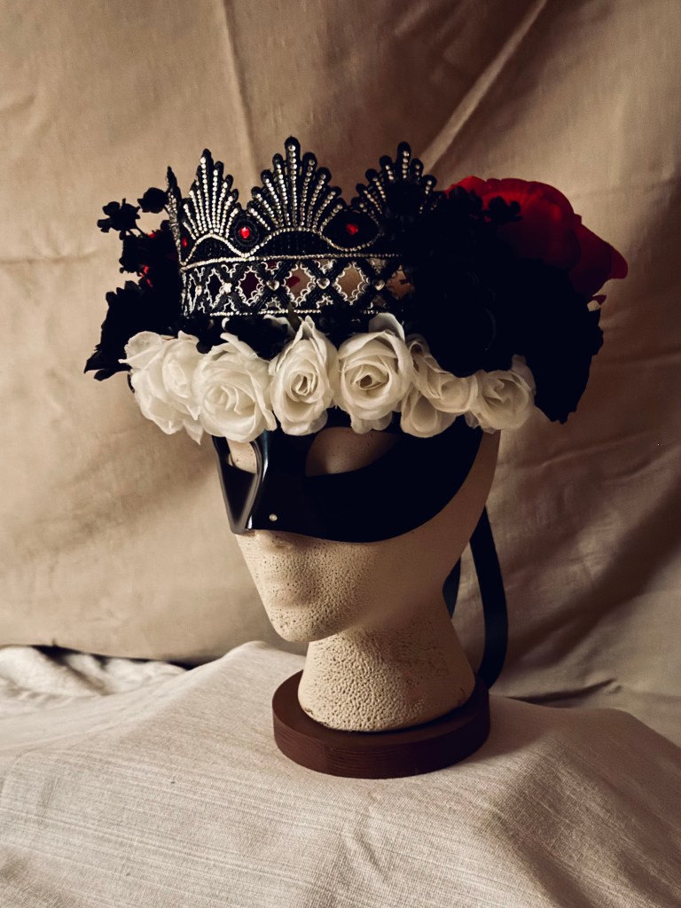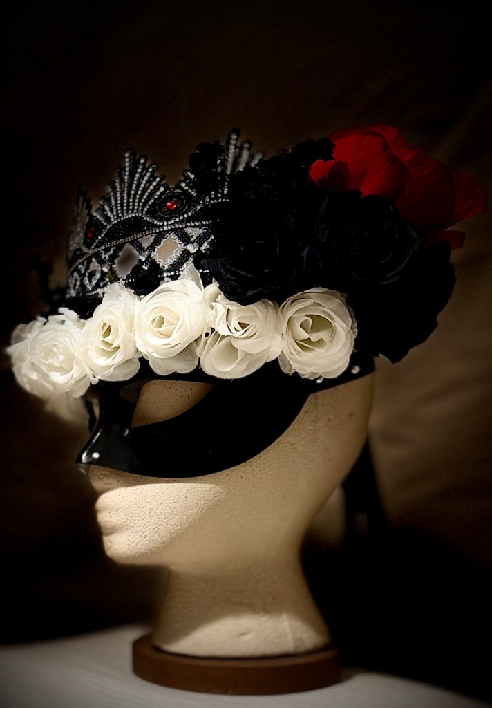 A Masquerade half mask as a follow up to the “Dark Queen”, who has lost her throne. Topped with a handmade crown made of fabric trim which is painted and decorated with rhinestones. Adorned with white roses along the bottom, a black floral spray on each side, and topped with an oversized red flower.