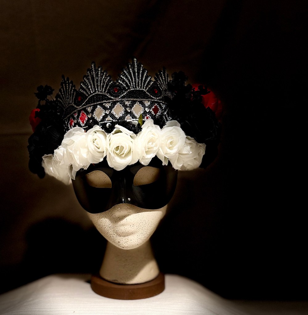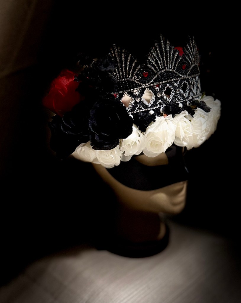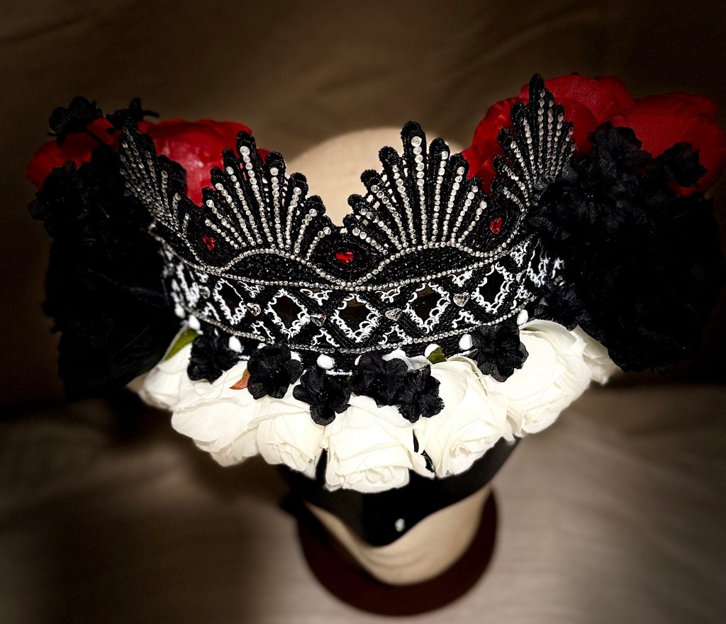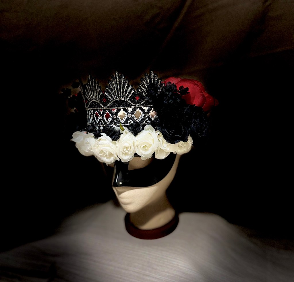 A Masquerade half mask as a follow up to the “Dark Queen”, who has lost her throne. Topped with a handmade crown made of fabric trim which is painted and decorated with rhinestones. Adorned with white roses along the bottom, a black floral spray on each side, and topped with an oversized red flower.