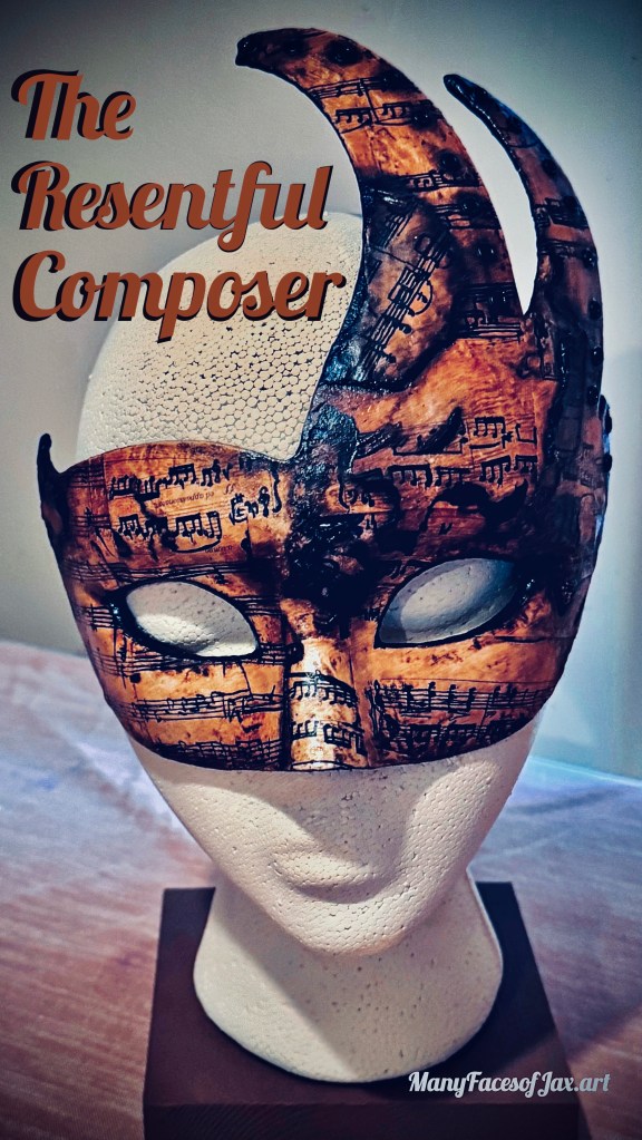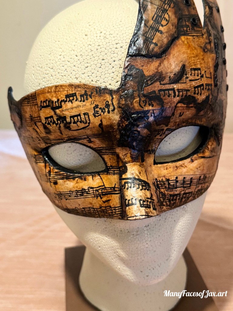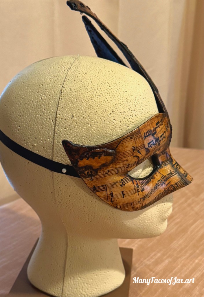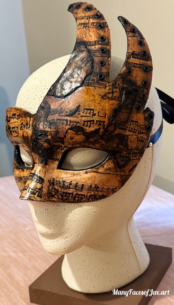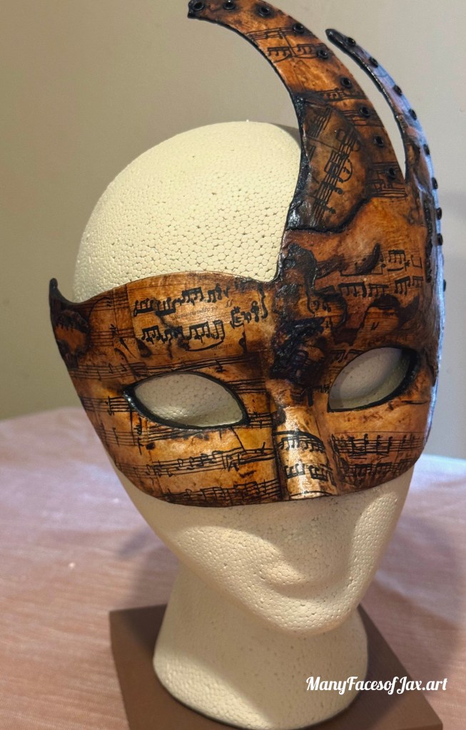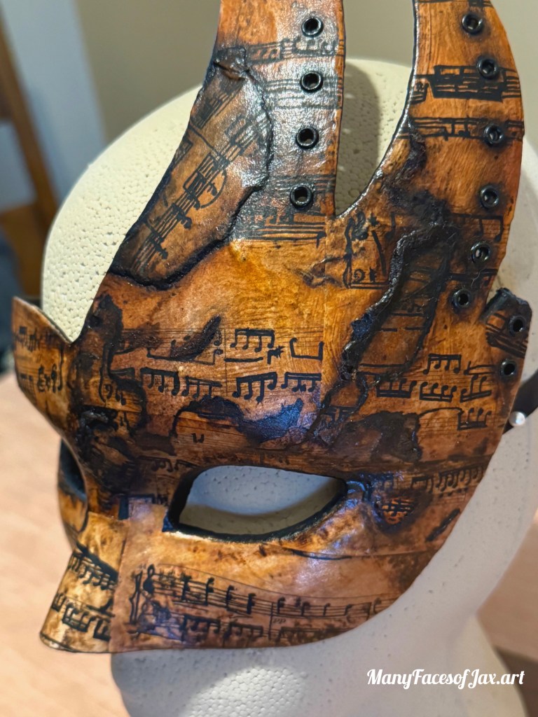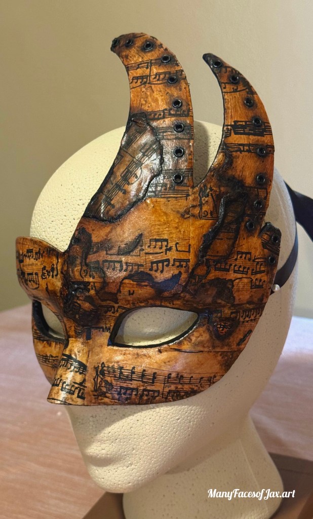The fourth in “The Musicians” series, a masquerade half mask with three “horns” on the left side. The mask is covered in music sheets that were drawn and burned after application. The “horns” each feature eyelets on the right side.