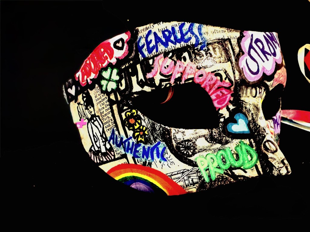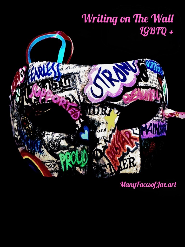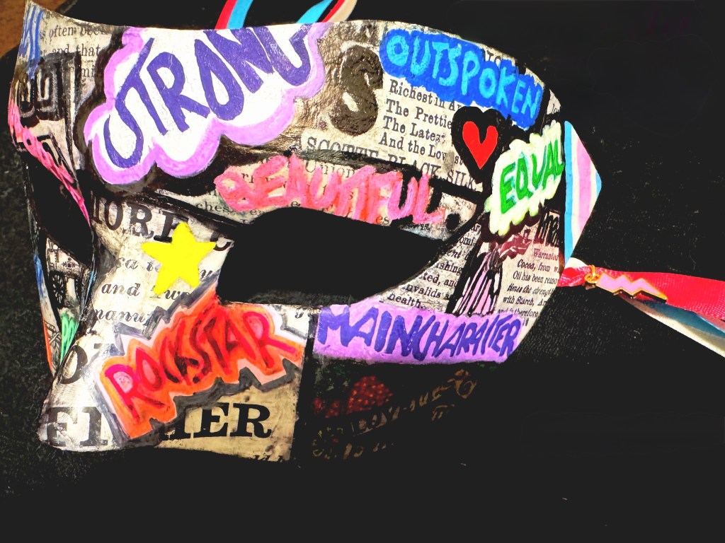 A masquerade half mask designed for the lgbtq+ community to resemble city walls layered in advertisements and graffiti. There are lightning charms at the start of the ribbon on each side. There are three ribbons representing the colors on the trans flag.